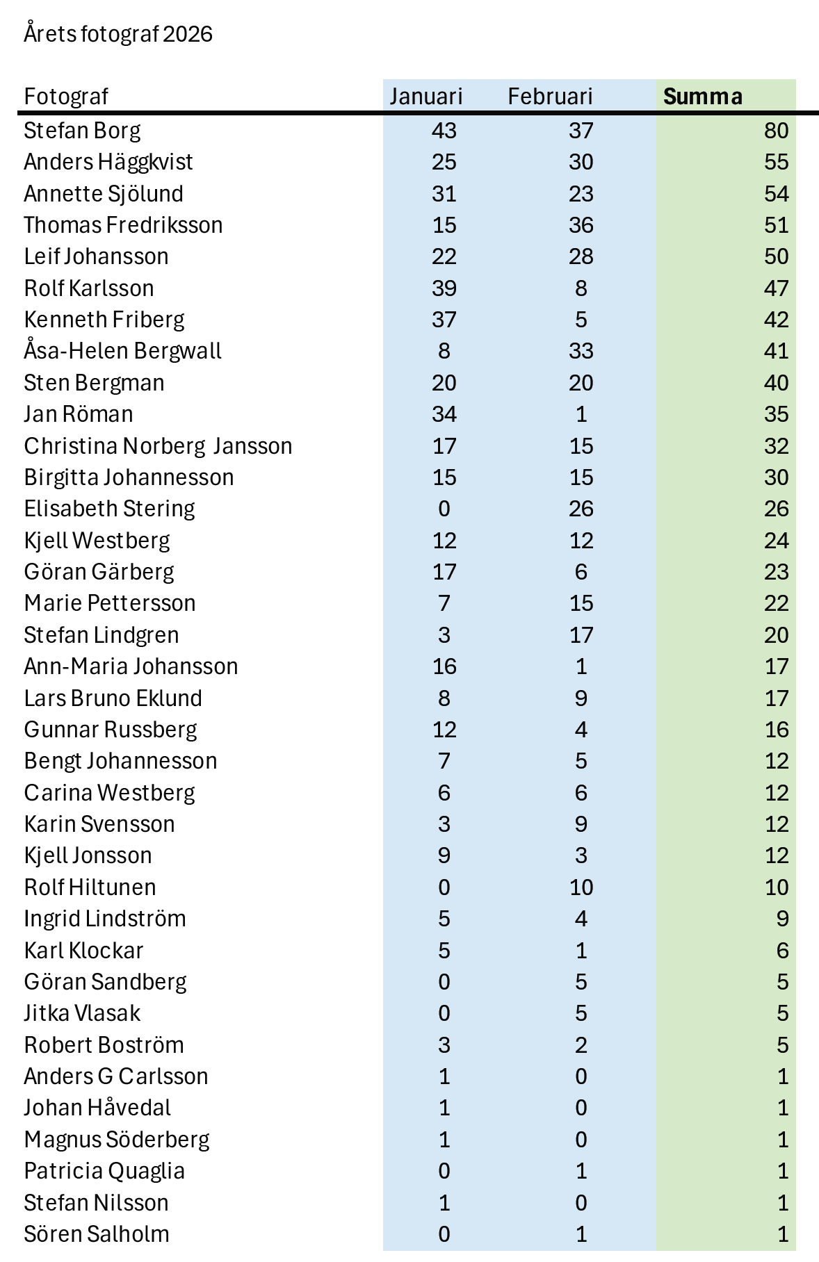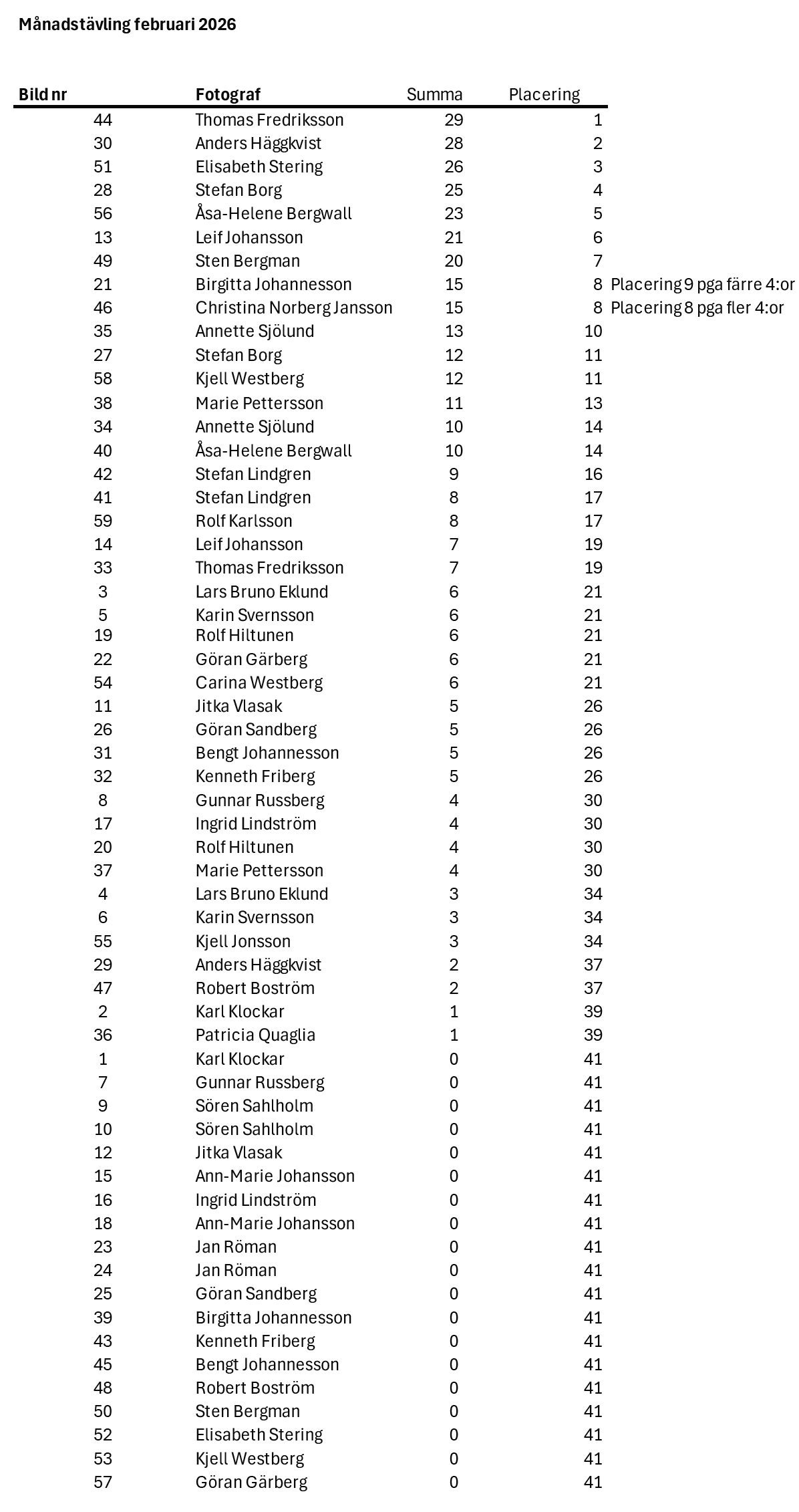 I februari månads månadstävling deltog 59 bilder från totalt 32 fotografer. 26 personer röstade. Även i februari så var det alltså nästan lika många bilder som i januari, 59 mot 60.